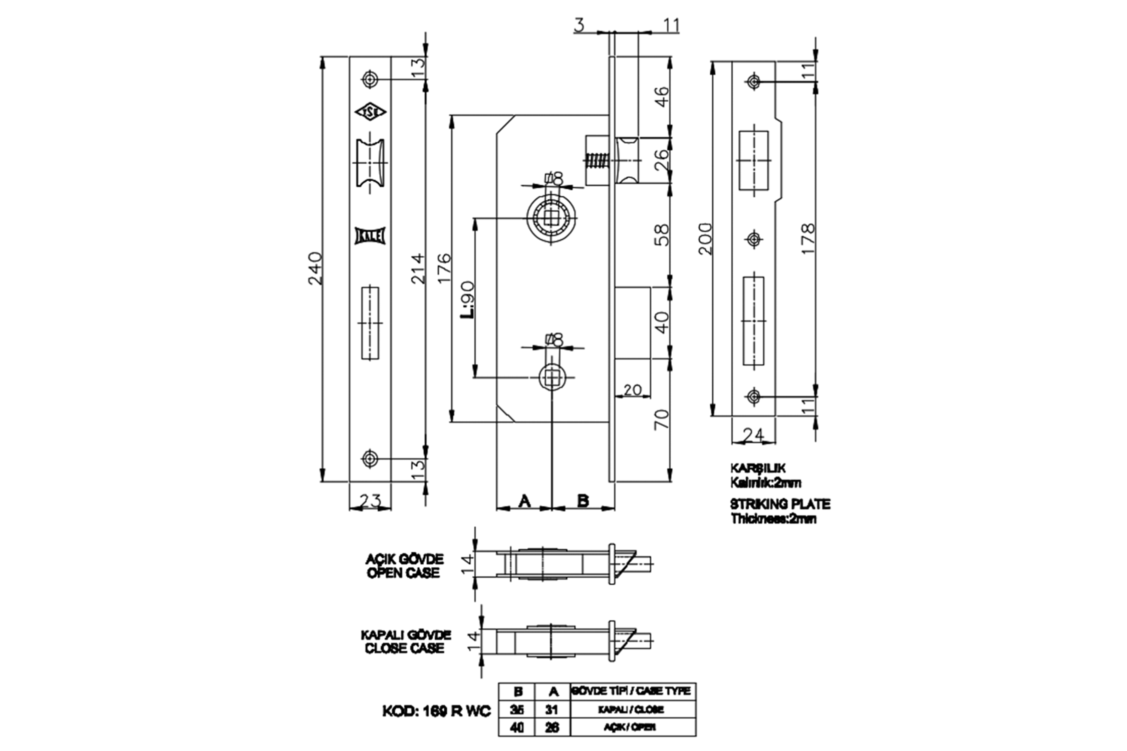 Kale Kilit 169R Banyo - WC Kilidi 35 mm Nikel